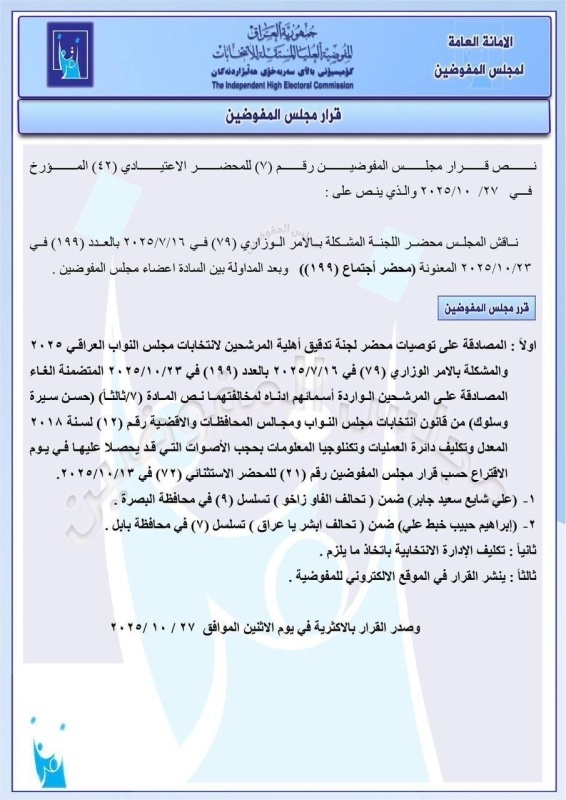 وجاء في بيان رسمي للمفوضية أن القرار صدر عن مجلس المفوضين بعد استكمال مراجعة الملفات القانونية والأمنية للمرشحين، مؤكدة أن الاستبعاد تم وفق المادة المتعلقة بشروط الترشح التي تشترط النزاهة والسيرة الحسنة، وعدم صدور أحكام أو وجود شبهات قد تؤثر على الثقة العامة.
