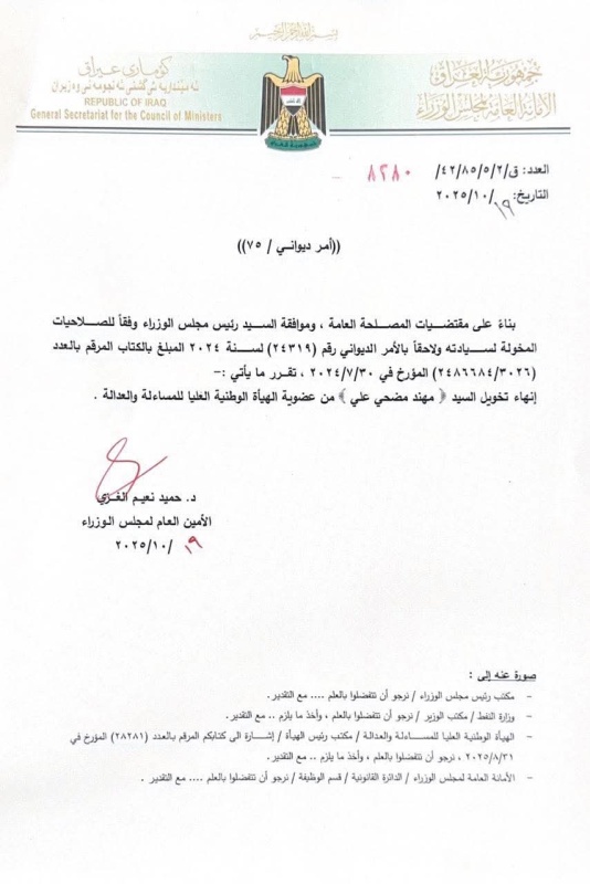 أصدر الأمين العام لمجلس الوزراء حميد نعيم الغزي، أمرًا ديوانيًا جديدًا يحمل الرقم (75) بتاريخ 19 تشرين الأول 2025، يقضي بإنهاء تكليف مهند مضحي علي من عضوية الهيئة الوطنية العليا للمساءلة والعدالة.