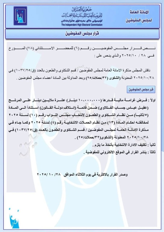وذكرت المفوضية في قرارها رقم (6) للمحضر الاستثنائي (78)، أنها استندت في قرارها إلى أحكام المادة (23/ثانياً) من نظام الحملات الانتخابية رقم (4) لسنة 2023، بناءً على ما ورد في مذكرة الأمانة العامة وقسم الشكاوى والطعون.