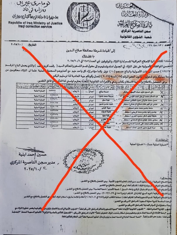 نفى مدير سجن الناصرية المركزي، حسين أحمد بنية، اليوم الأربعاء، بشكل قاطع صحة الكتاب المتداول والمنسوب إلى إدارة السجن، والذي تناول مزاعم حول شمول عدد من النزلاء المحكومين بارتكاب جريمة سبايكر بقانون العفو العام.