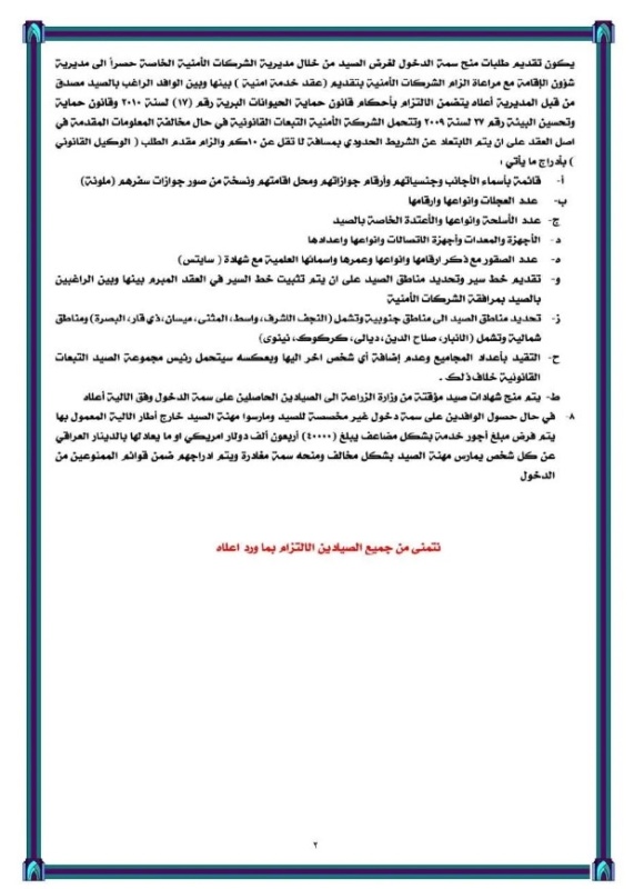 وأشار البيان إلى أن تقديم طلبات منح السمة يتم عبر مديرية الشركات الأمنية الخاصة، مع إلزام هذه الشركات بتقديم عقد خدمة أمنية مصدق من المديرية بين الشركة والوافد الراغب بالصيد. كما شددت الوزارة على ضرورة الالتزام التام بأحكام قانون حماية الحيوانات البرية رقم 17 لسنة 2010 وقانون حماية وتحسين البيئة رقم 27 لسنة 2009، مع التأكيد على تحمل الشركة الأمنية المسؤولية القانونية في حال تقديم معلومات مخالفة في العقد، والابتعاد عن الشريط الحدودي بمسافة لا تقل عن 10 كم.