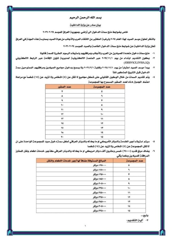 أعلنت وزارة الداخلية، مساء الأربعاء، عن الضوابط والإجراءات المالية الخاصة بمنح سمات الدخول لموسم الصيد 2025-2026، وذلك بعد ساعات من اعتقال مجموعة صيادين عرب في بادية المثنى.