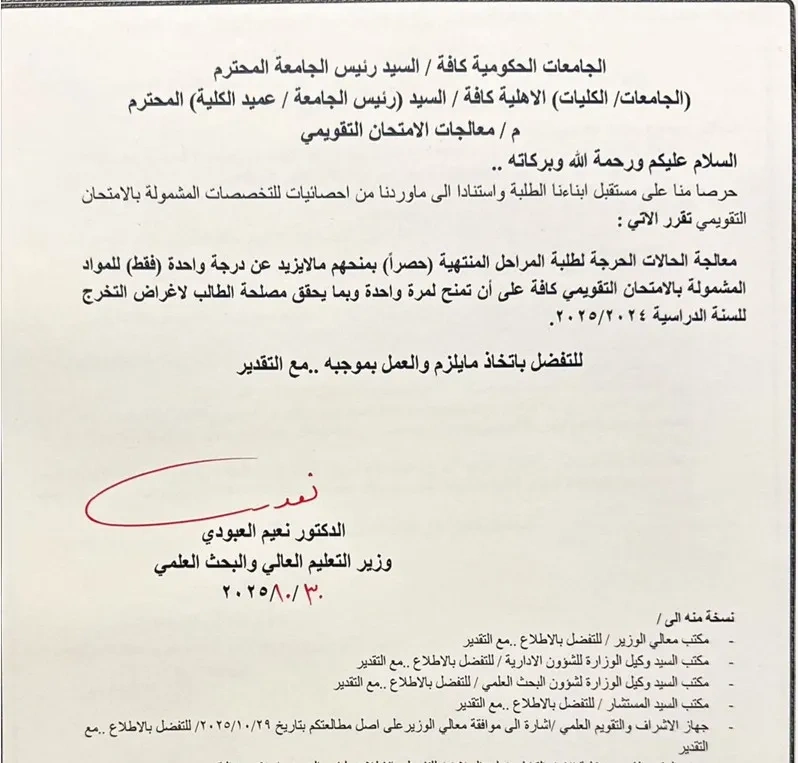 معالجة الحالات الحرجة لطلبة المراحل المنتهية حصرا بمنحهم ما لا يزيد عن درجة واحدة فقط للمواد المشمولة بالامتحان التقويمي كافة على أن تمنح لمرة واحدة وبما يحقق مصلحة الطالب لأغراض التخرج للسنة الدراسية 2025/2024.