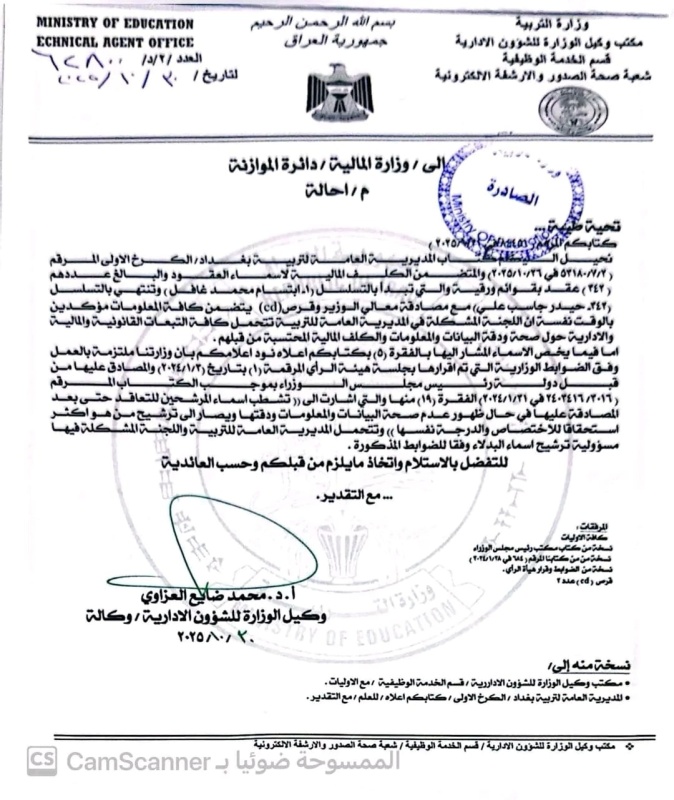 وقال النائب الاول لرئيس اللجنة في منشور تابعته "واضح"، إن " وزارة التربية وافقت على رفع كتاب رسمي لمخاطبة وزارة المالية بشأن عقود 2024 غير المستلمين لرواتبهم والخاص بـ (رفع التباين)".
