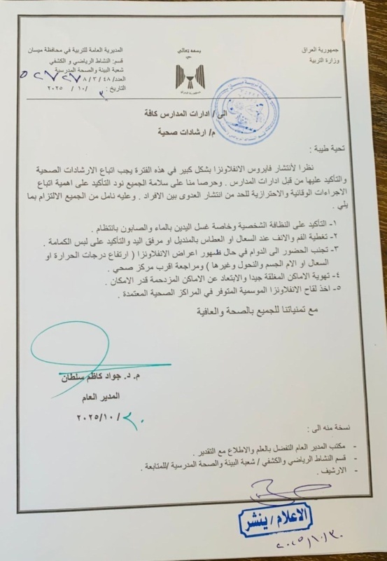 أصدرت المديرية العامة للتربية في محافظة ميسان، حزمة من الإرشادات الصحية العاجلة موجهة إلى جميع المدارس للحد من الانتشار الكبير لفيروس الأنفلونزا الموسمية.