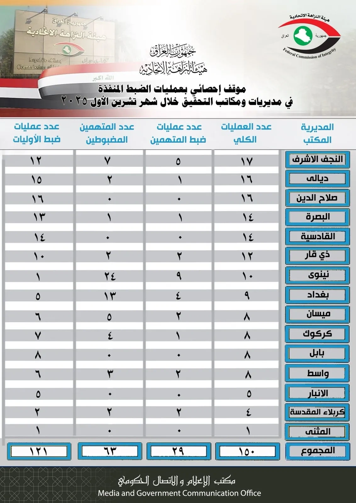 أعلنت هيئة النزاهة، اليوم الأحد، الموقف الإحصائي لعمليات الضبط المنفذة من قبل مديريات و مكاتب تحقيق الهيئة خلال شهر تشرين الأول لعام 2025.