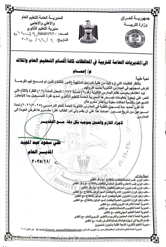 وذكرت الوزارة في بيان، ان المديرية العامة للتعليم العام والاهلي والاجنبي تقرر تمديد مدة تسجيل الطلبة في المدارس الثانوية العامة للعام الدراسي 2026 - 2025 لأسبوعين من تاريخ صدور الكتاب أدناه، على ان يقدم ولي الأمر عذراً مشروعاً لغرض العودة الى المدارس.