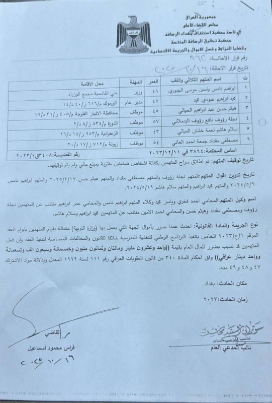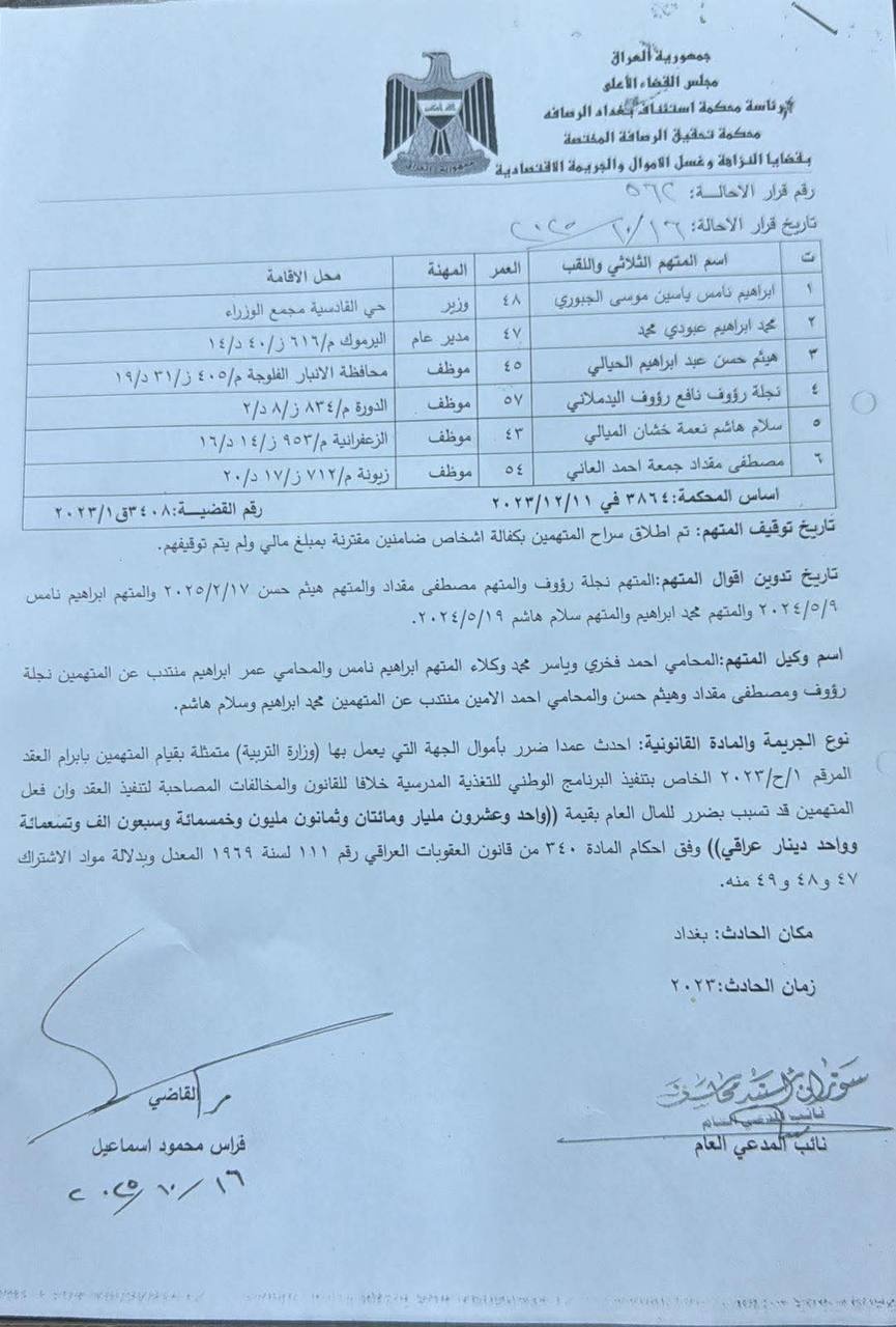 قررت محكمة تحقيق النزاهة، احالة وزير التربية، ابراهيم نامس الجبوري مع خمسة موظفين من الوزارة الى محكمة الجنايات.