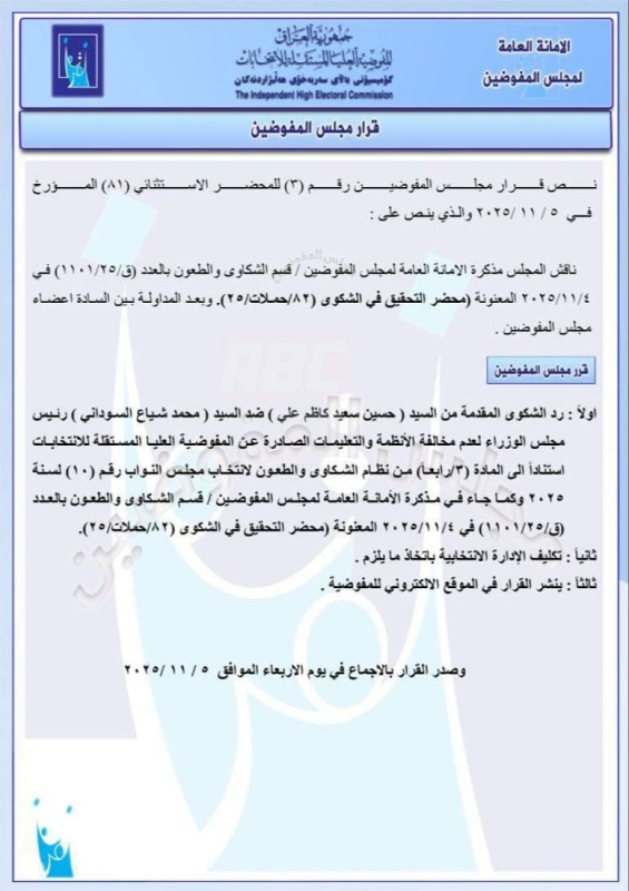 وبحسب وثيقة حصلت عليها "واضح"، فإن "مجلس المفوضين رد شكوى النائب حسين عرب ضد رئيس الوزراء لعدم مخالفة الأنظمة والتعليمات الصادرة عن مفوضية الانتخابات، وجاء القرار استنادًا إلى المادة 3 / رابعاً من نظام الشكاوى والطعون لانتخاب مجلس النواب رقم 10 لسنة 2025".