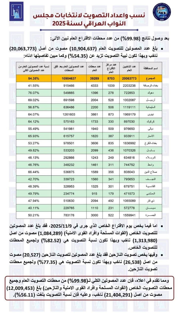أعلنت المفوضية العليا المستقلة للانتخابات، اليوم الأربعاء، نسب وأعداد المشاركين في التصويت لانتخابات مجلس النواب العراقي لعام 2025.