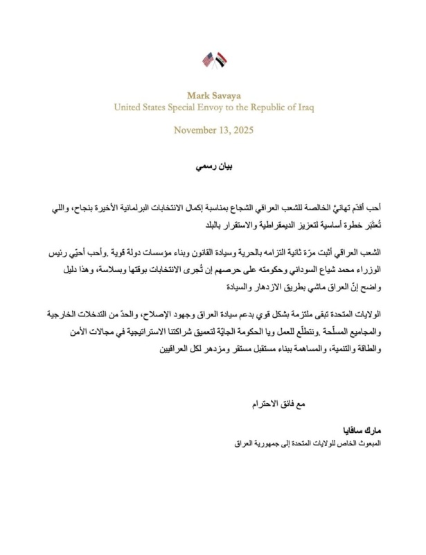 هنأ مارك سافيا، المبعوث الأميركي الجديد، الخميس، الشعب العراقي على إتمام الانتخابات البرلمانية بنجاح، مؤكداً أن الشعب أثبت مرة ثانية التزامه بالحرية وسيادة القانون وبناء مؤسسات قوية. وأضاف سافيا أن الأمم المتحدة تظل ملتزمة بقوة بدعم سيادة العراق وجهود الإصلاح، والعمل على الحد من التدخلات الخارجية والمجاميع المسلحة.