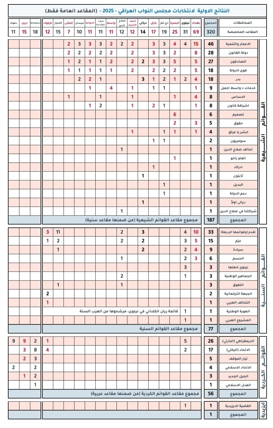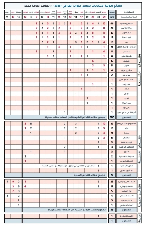 وأظهر الجدول، أن القوائم الشيعية حصلت على 187 مقعدًا من مجموع المقاعد العامة، متضمنةً بعض المقاعد ضمن القوائم السنية.