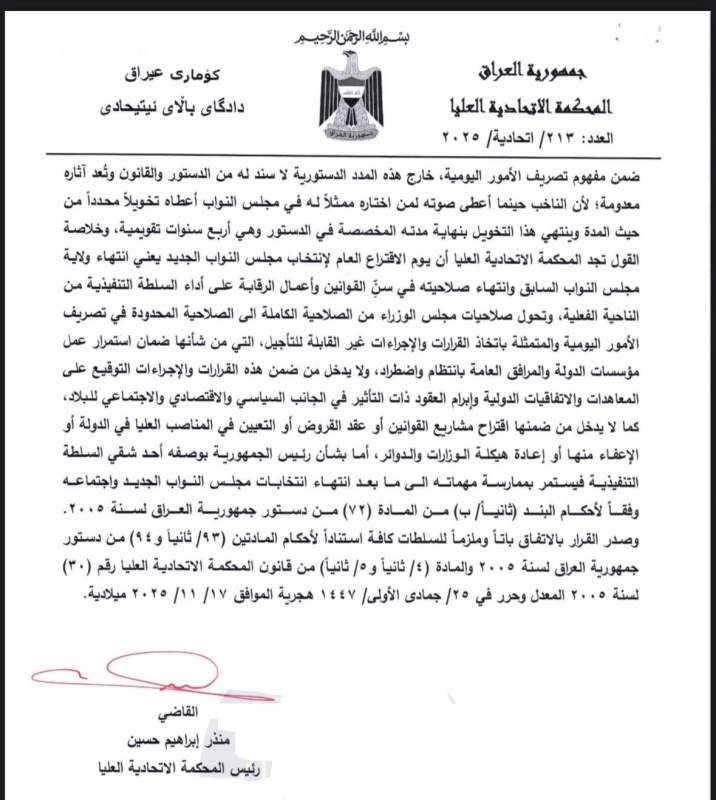 5- المبدأ:( تجد المحكمة الاتحادية العليا إن اليوم الذي تجري فيه الانتخابات العامة لعضوية مجلس النواب ، يُعد نهاية طبيعية لدورة كل من - مجلس النواب السابقة ومجلس الوزراء المنبثق عنه - وتنتهي به شرعيتهما السياسية ، بمجرد انتخاب مجلس النواب الجديد ، وذلك تعزيزاً للشرعية الدستورية للمؤسسات المنتخبة ، ولمنع احتكار السلطة أو تمديدها بغير سندٍ دستوري ) .