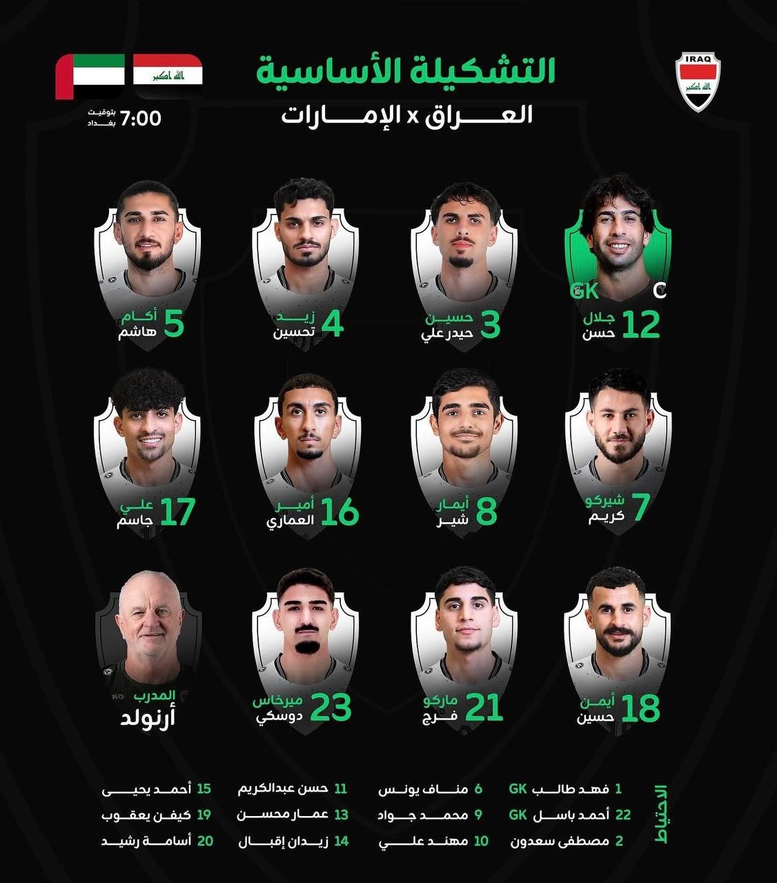 تنشر منصة "واضح"، تشكيلة منتخبنا الوطني لمواجهة نظيره الإماراتي، مساء اليوم الثلاثاء، في إياب المحلق الآسيوي، على ملعب البصرة الدولي.