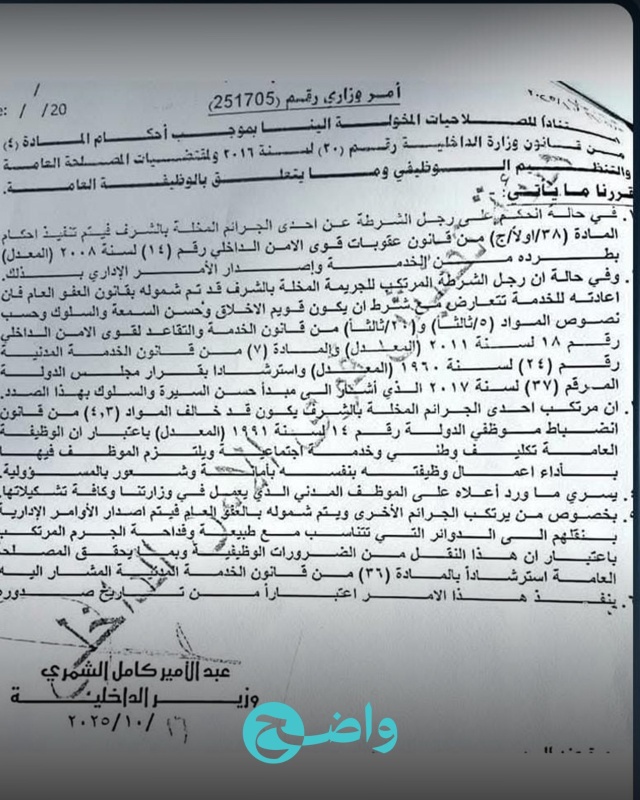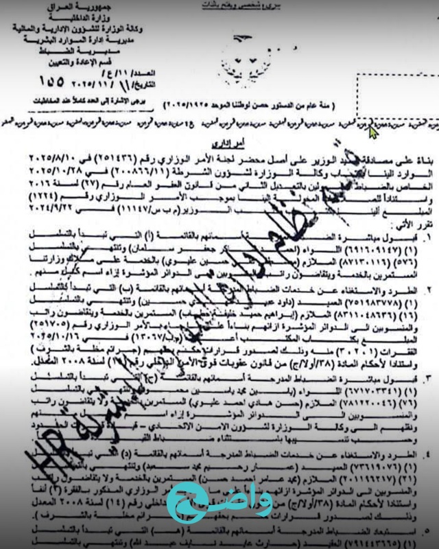 ويأتي القرار وفقاً للأمر الوزاري رقم (251705) الصادر عن وزير الداخلية عبد الأمير كامل الشمري، الذي أوضح فيه أن الإجراءات تشمل الضباط والمنتسبين الذين ارتكبوا مخالفات أثناء خدمتهم السابقة، وتمت مباشرتهم فورياً في بعض الحالات.