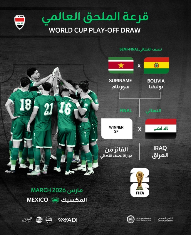 أسفرت قرعة الملحق العالمي المؤهل إلى نهائيات كأس العالم 2026 عن مواجهة منتخب العراق الوطني للفائز من مباراة نصف النهائي بين بوليفيا وسورينام.