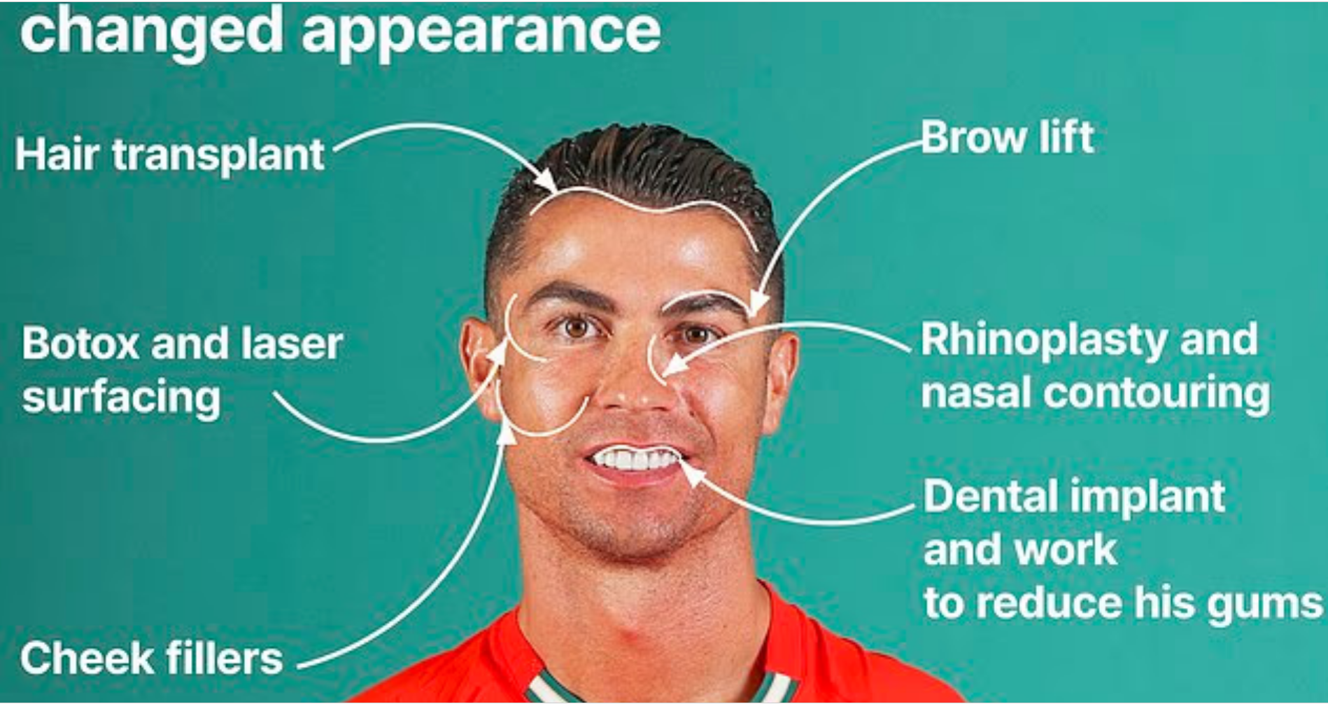 كما يعتقد أن رونالدو خضع لعملية رفع الحاجبين بالمنظار وإجراءات ليزر لتحسين ملمس البشرة.