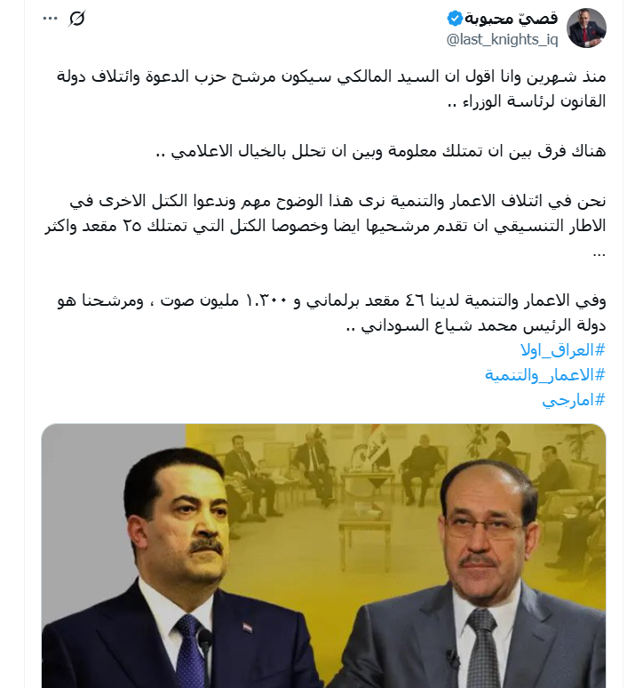 وتابع: "في الإعمار والتنمية لدينا 46 مقعداً برلمانياً و1.3 مليون صوت، ومرشحنا (لرئاسة الوزراء) هو محمد شياع السوداني".