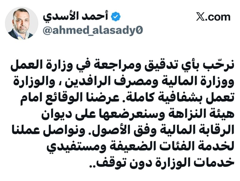 وكتب الاسدي في تدوينة تابعتها "واضح": "نرحب بأي تدقيق ومراجعة في وزارة العمل ووزارة المالية ومصرف الرافدين ، والوزارة تعمل بشفافية كاملة" .