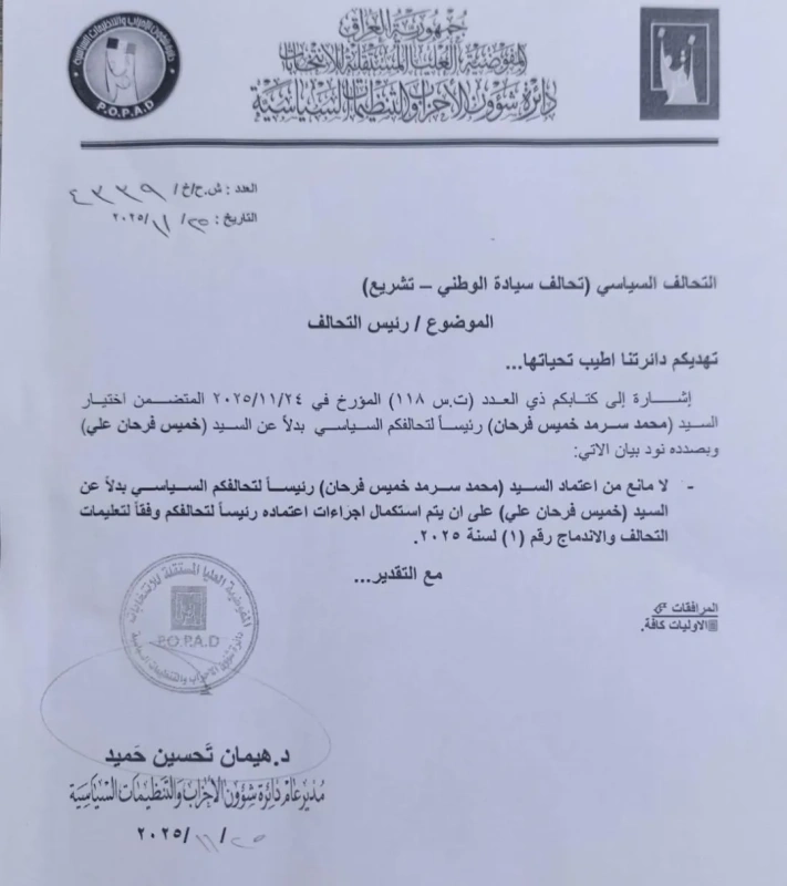وجاء في وثيقة صادرة عن مفوضية الانتخابات، "عدم وجود أي مانع من اعتماد محمد سرمد خميس فرحان رئيساً لتحالف سيادة الوطني، بدلاً عن خميس فرحان علي، وذلك استناداً إلى الطلب المقدم بتاريخ 24/11/2025 والمتعلق بتغيير رئاسة التحالف".