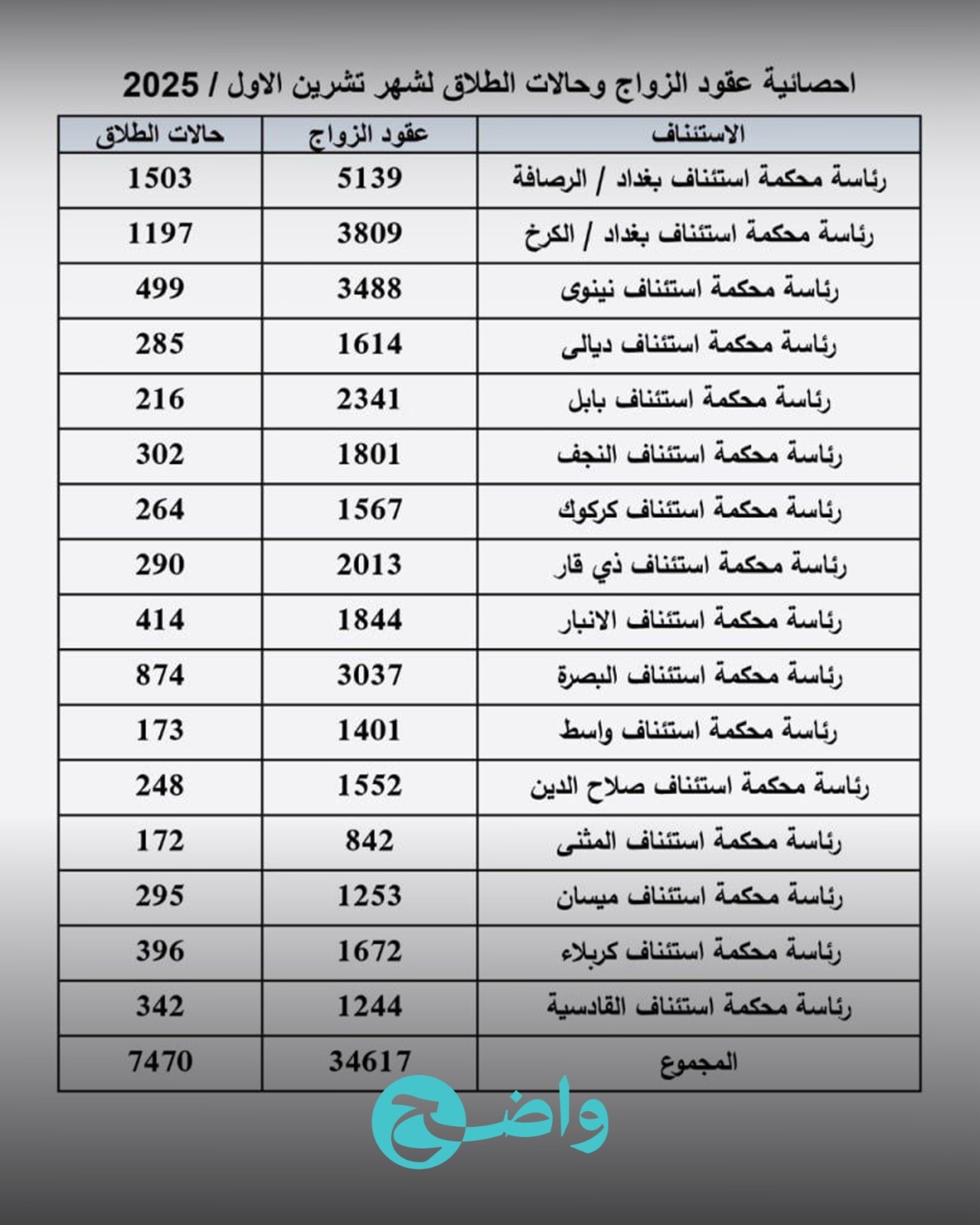 أعلن مجلس القضاء الأعلى، اليوم الأربعاء، الإحصائية الرسمية لعقود الزواج وحالات الطلاق المسجلة في محاكم العراق.