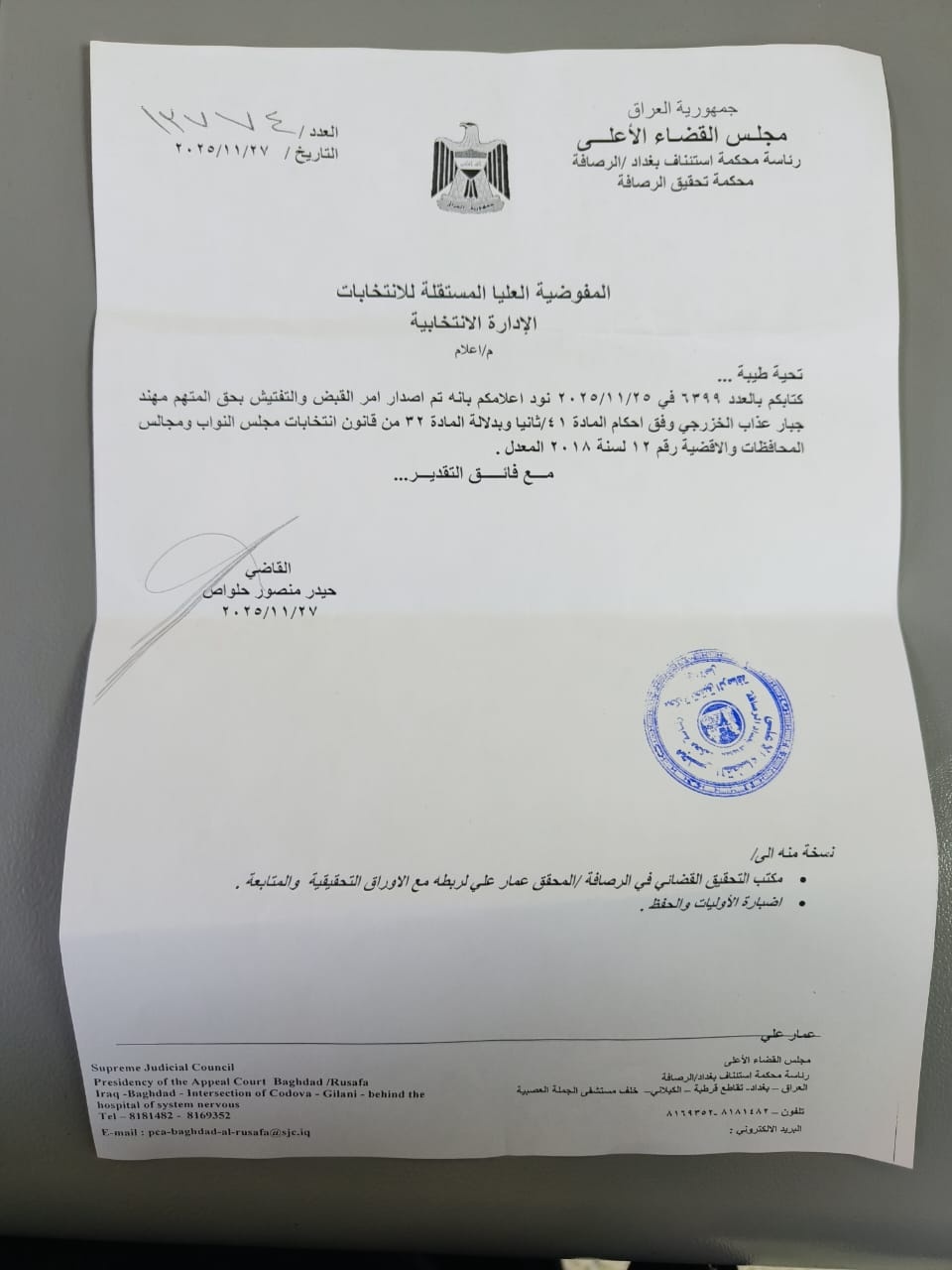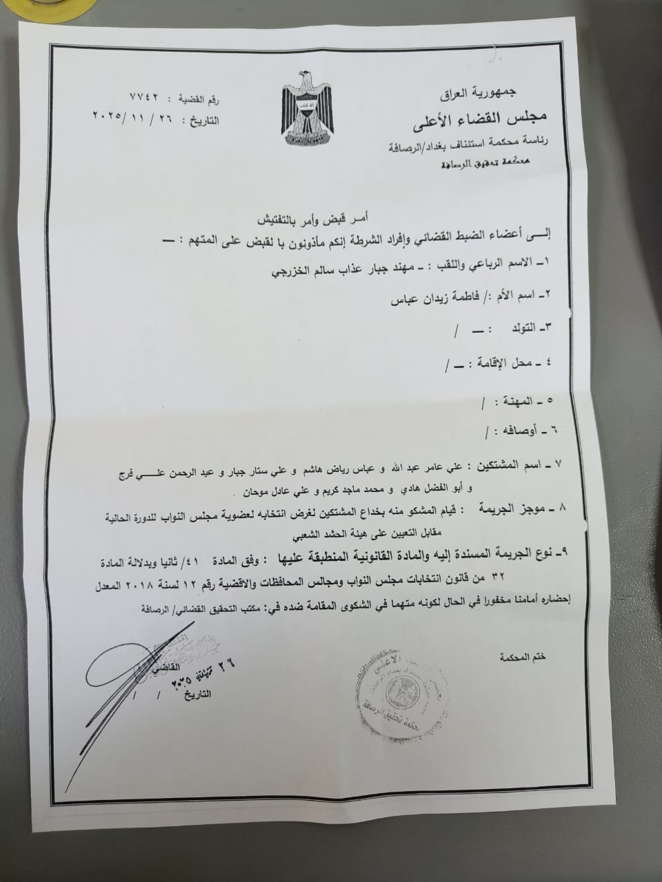 أظهرت وثيقة رسمية، اليوم الخميس، صدور أمر قبض بحق المرشح الفائز في الانتخابات العراقية 2025 مهند الخزرجي، وذلك بقضية تأسيس "لواء وهمي" في الحشد الشعبي لغرض الحصول على أصوات الشباب الراغبين بالتعيين.