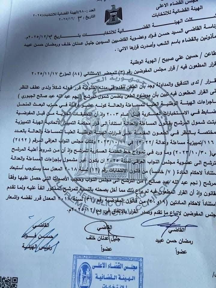 وذكر القرار الصادر بالعدد (980/الهيئة القضائية للانتخابات/2025) والمؤرخ بتاريخ 3 كانون الأول 2025، أن الهيئة المكوّنة من القاضي السيد حسن فؤاد رئيسًا، وعضوية القاضيين جليل عدنان خلف ورمضان حسن عبيد، قررت قبول الطعن المقدم من المواطن حسين علي صبيح شكلًا، ومن ثم نقض قرار مجلس المفوضين رقم (3) الصادر في المحضر الاستثنائي رقم (84) بتاريخ 17 تشرين الثاني 2025.