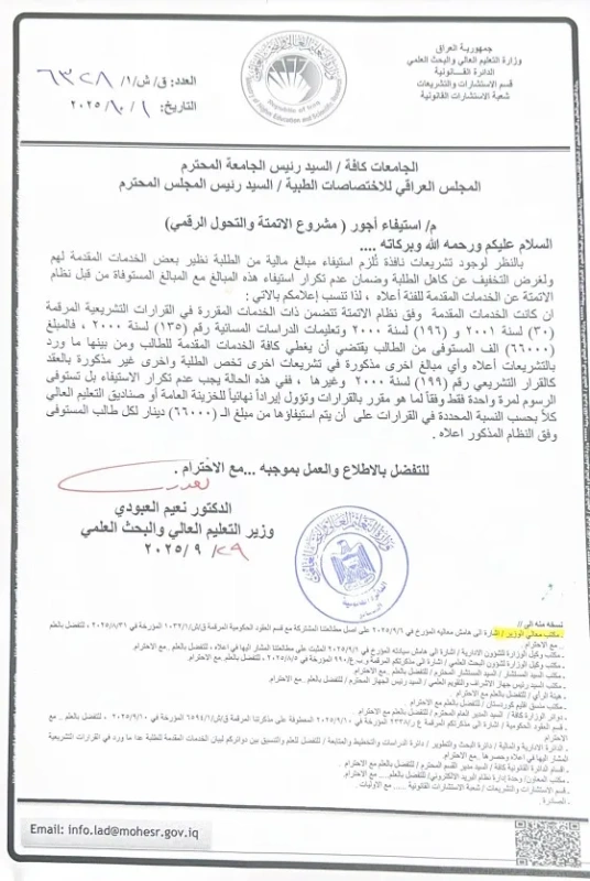 أصدر وزير التعليم العالي والبحث العلمي نعيم العبودي، اليوم الأربعاء، توجيهاً بشأن رسوم المنصة الرقمية البالغة 66 ألف دينار.