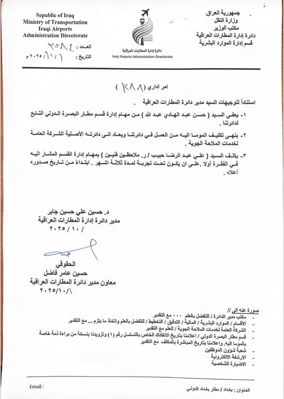 وبحسب وثيقة رسمية صادرة عن الوزارة، فقد تقرر إعفاء حسن عبد الهادي من منصبه كمدير لمطار البصرة الدولي، وتكليف علي عبد الرضا بإدارة المطار ابتداءً من تاريخ صدور القرار.