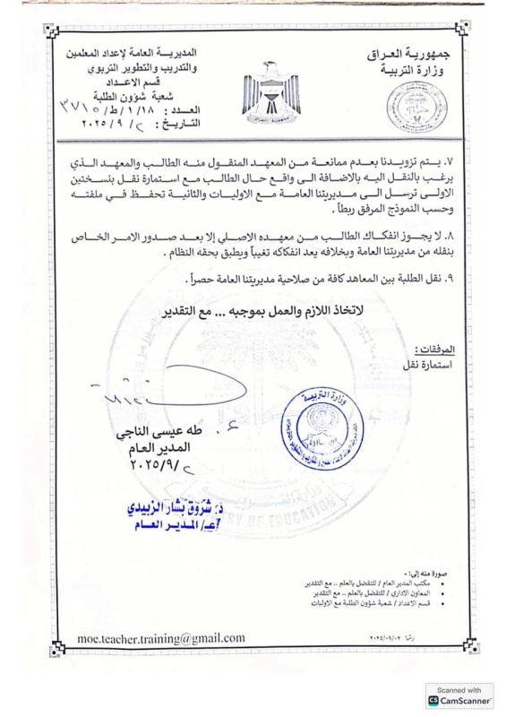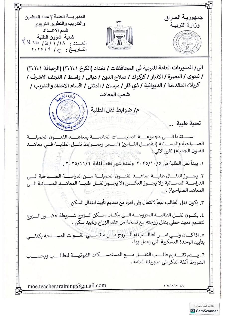 واشار الى ان نقل الطلبة بين المعاهد كافة يتم عبر المديرية العامة لإعداد المعلمين والتدريب والتطوير التربوي فقط، ويكون بتقديم طلب النقل مع المستمسكات الثبوتية إلى المديرية العامة حصراً.