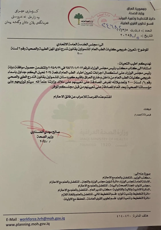 أعلن وزير الصحة صالح الحسناوي، اليوم الأحد، موافقة رئيس مجلس الوزراء محمد شياع السوداني على استكمال إجراءات تعيين خريجي كليات الطب العام للدفعة 2024.