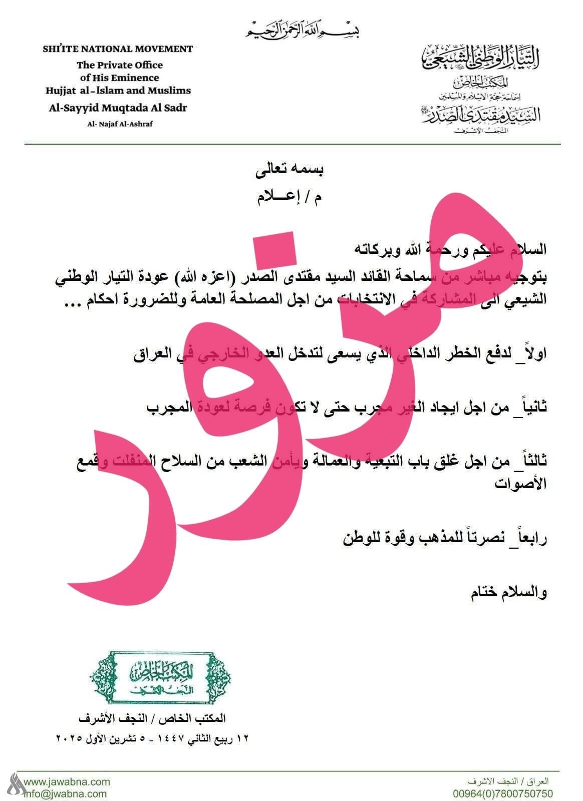 نفى التيار الوطني الشيعي، اليوم الأحد، صحة وثيقة تم تداولها عبر وسائل الإعلام ومواقع التواصل الاجتماعي، زُعم أنها صادرة عن مكتب السيد مقتدى الصدر وتتعلق بعودة التيار للمشاركة في الانتخابات المقبلة، مؤكداً أن الوثيقة مزورة ولا تمتّ للحقيقة بصلة.