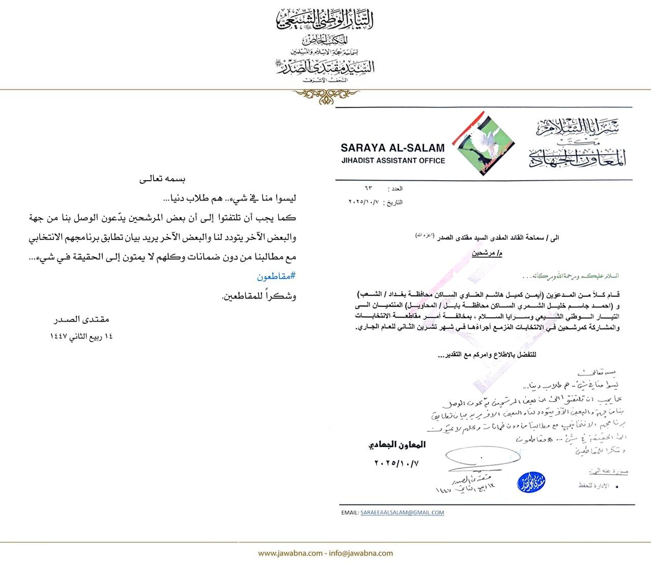 وبحسب بيان لمكتبه الخاص ورد لمنصة "واضح"، فقد علق الصدر بالقول: "ليسوا منا في شيء.. هم طلاب دنيا… كما يجب أن تلتفتوا إلى أن بعض المرشحين يدّعون الوصل بنا من جهة والبعض الآخر يتودد لنا والبعض الآخر يريد بيان تطابق برنامجهم الانتخابي مع مطالبنا من دون ضمانات وكلهم لا يمتون إلـى الحقيقة فـي شيء".