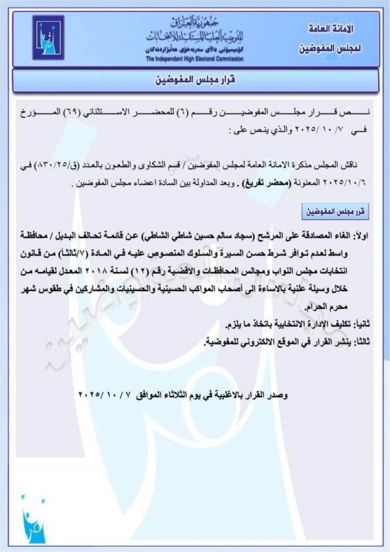 وأكد المصدر الذي رفض الكشف عن اسمه لأسباب تتعلق بوظيفته، أن "القرار صدر بالإجماع اليوم الثلاثاء 7 تشرين الأول/أكتوبر من مجلس المفوضين"، مبينًا أن "القرار قابل للطعن".
