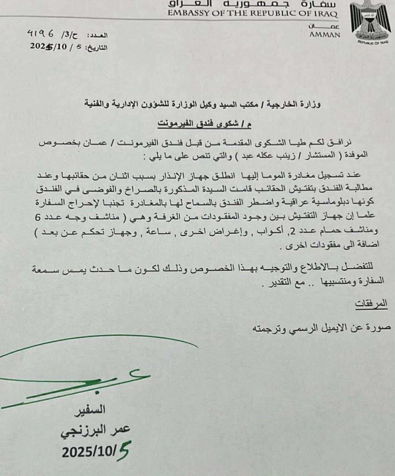في وثيقة رسمية صادرة عن سفارة جمهورية العراق في عمّان، وردت تفاصيل حادثة تتعلق بإحدى الدبلوماسيات العراقيات، تتهمها إدارة فندق فيرمونت عمّان بالاستيلاء على مناشف وأغراض من جناح فندقي كانت تقيم فيه.