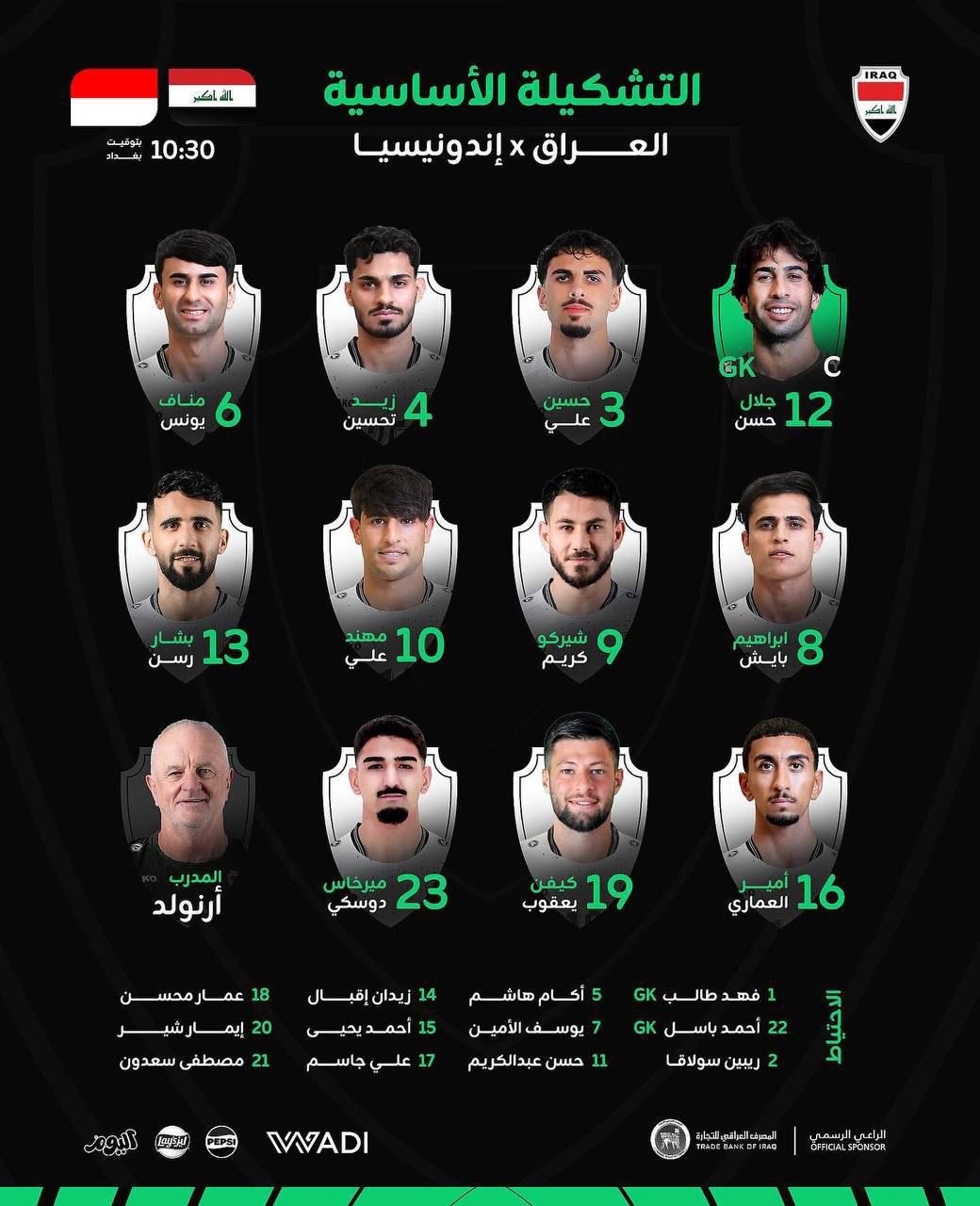 تنشر منصة واضح، تشكيلة المنتخب الوطني العراقي لمواجهة نظيره الإندونيسي في الملحق الآسيوي المؤهل لمونديال 2026.