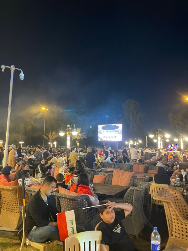 فمنذ ساعات ما قبل انطلاق صافرة البداية، اتخذت العاصمة ملامح مختلفة تماماً؛ ازدانت السيارات والمحال التجارية بالأعلام العراقية، وتعالت الأغاني الوطنية والحماسية من مكبرات الصوت في الشوارع والأحياء الشعبية، بينما اكتظت المقاهي والمطاعم بالمشجعين الذين احتشدوا أمام الشاشات بترقبٍ كبير وأعين لا تفارق تفاصيل اللقاء.