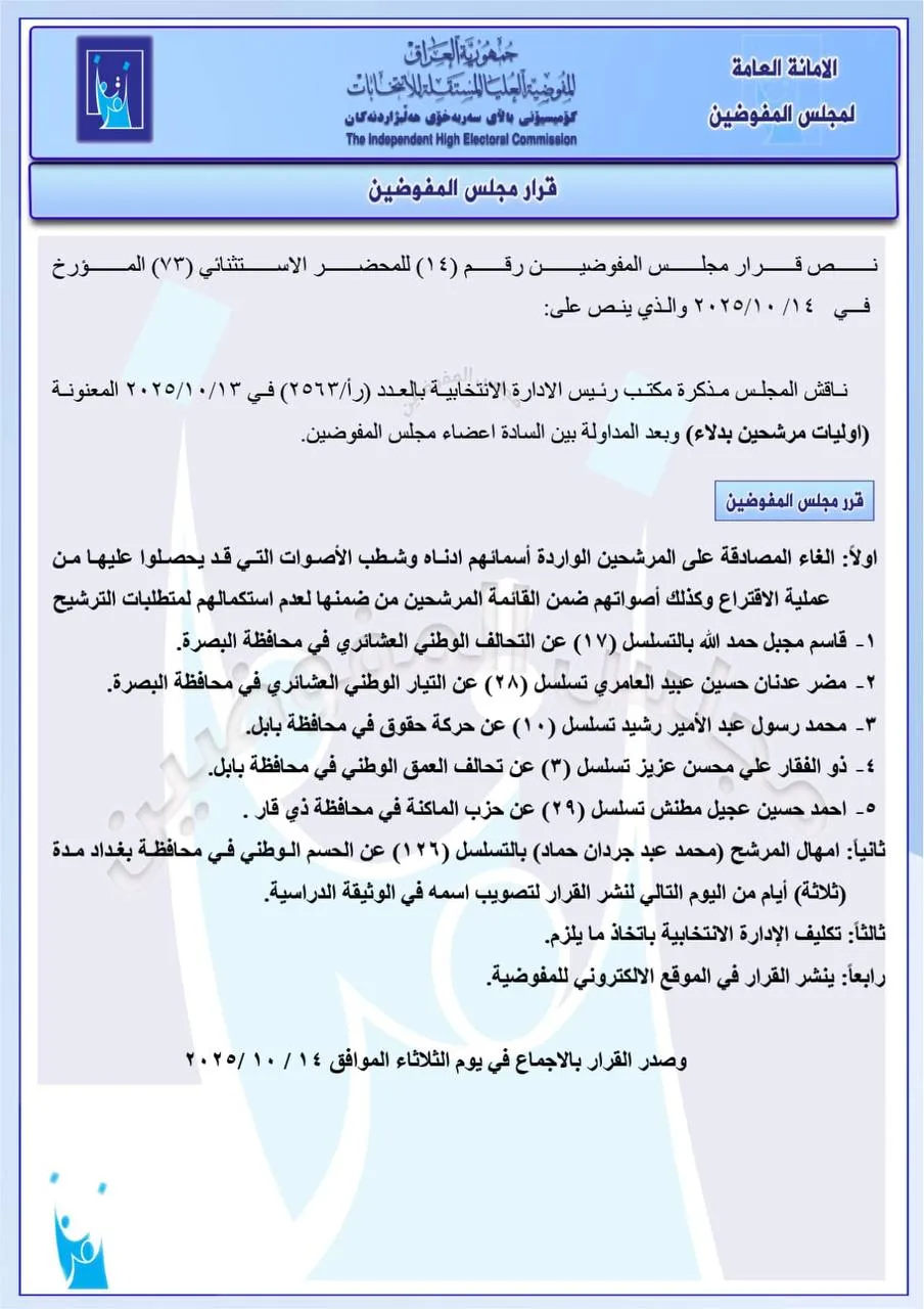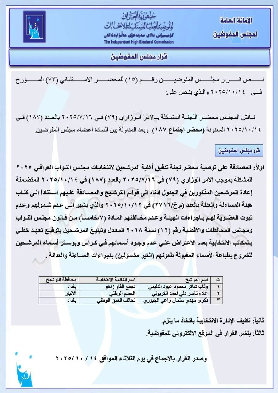 أعلنت المفوضية العليا المستقلة للانتخابات، اليوم الأربعاء، إعادة 3 مرشحين مستبعدين إلى قوائم الترشيح لانتخابات مجلس النواب، وفقاً لوثائق صادرة عن مجلس المفوضين.