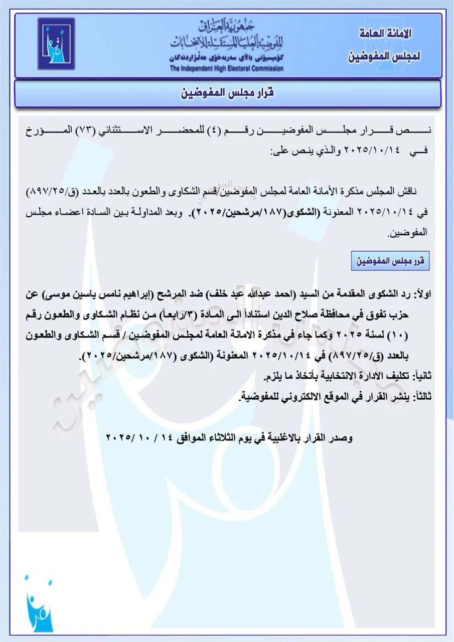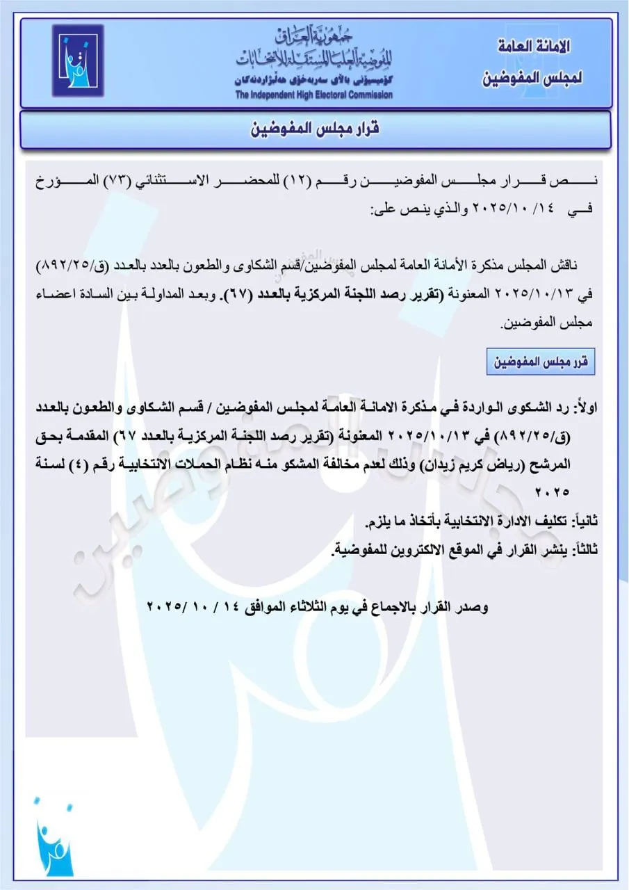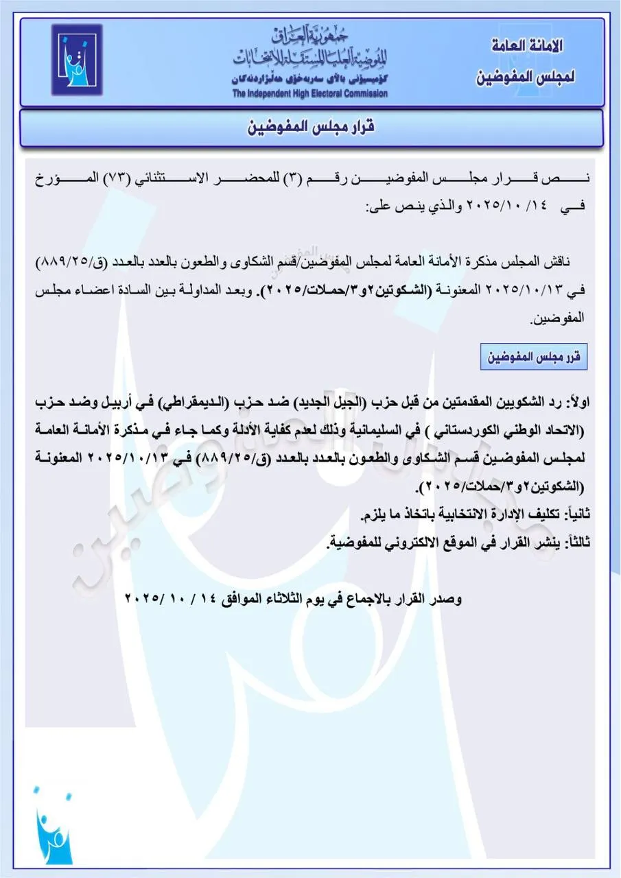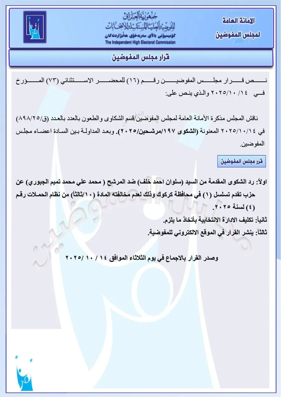 وتضمنت الوثائق أيضاً رد عدد من الشكاوى الخاصة بالمرشحين والمقدمة إلى مجلس المفوضين في مفوضية الانتخابات.