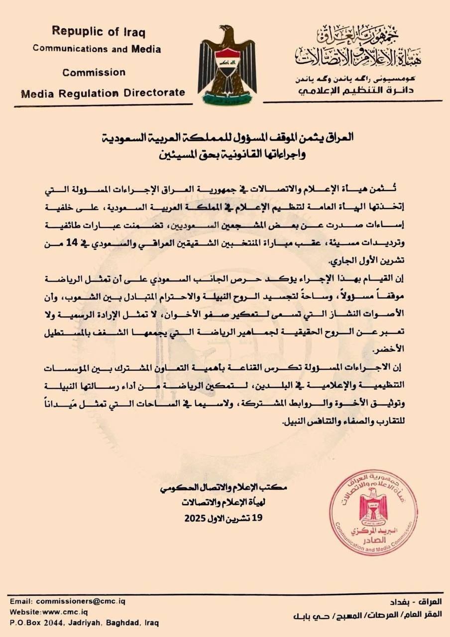وختمت هيئة الإعلام والاتصالات بيانها بالتأكيد على أن العراق حريص على مواصلة التنسيق مع الجانب السعودي لتمكين الرياضة من أداء رسالتها الإنسانية في بناء جسور التفاهم والصداقة بين الشعوب.
