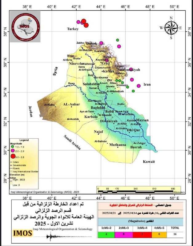 اعلنت هيئة الانواء الجوية،اليوم الثلاثاء. تسجيل 16 هزة ارضية في عموم محافظات البلاد.