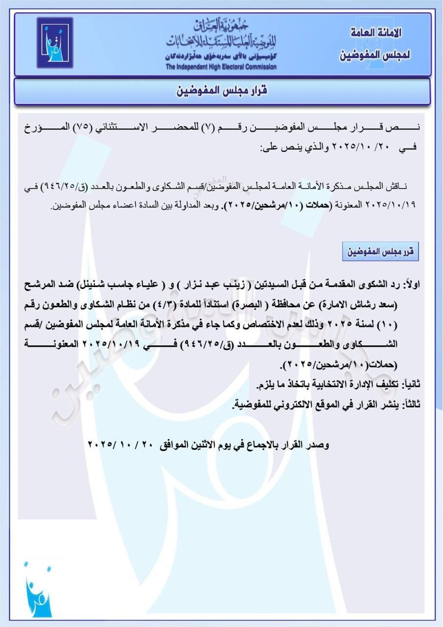 القرار الثالث: رفض المجلس الشكاوى المقدمة من كلٍّ من (زنيب عبد نزار) و**(علباء جاليب شينغل)** ضد المرشح (سعد عباس الأمارة) عن محافظة البصرة، بعد التحقق من عدم وجود مخالفة لأحكام النظام الانتخابي.