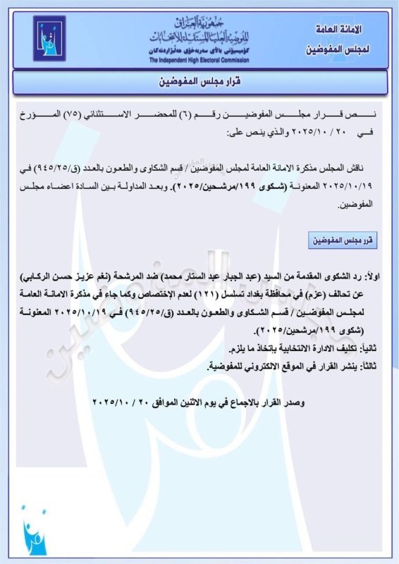 القرار السابع: رفض المجلس الشكوى المقدمة من المواطن (عبد الجبار عبد الستار محمد) ضد المرشحة (نغم عزيز حسن الركابي) عن تحالف العزم في بغداد، لعدم الاختصاص، بعد دراسة الشكوى والتحقق من حيثياتها القانونية.