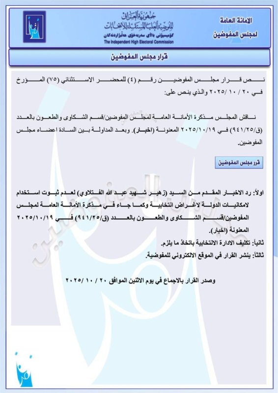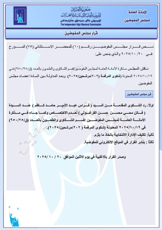 أصدر مجلس المفوضين في المفوضية العليا المستقلة للانتخابات، خلال اجتماعه الاستثنائي عدداً من القرارات الخاصة بالشكاوى والطعون المقدمة ضد عدد من المرشحين والقوائم الانتخابية، وذلك استناداً إلى المذكرات المرفوعة من الأمانة العامة للمجلس / قسم الشكاوى والطعون.