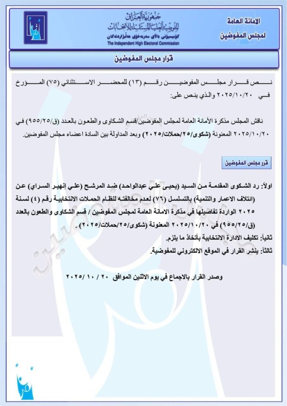 القرار الأول: رفض مجلس المفوضين الشكوى المقدمة من المواطن (يحيى علي عبد الواحد) ضد المرشح (علي نبهان السراي) عن ائتلاف الإعمار والتنمية، لعدم مخالفة نظام الحملات الانتخابية رقم (1) لسنة 2023. كما كلف المجلس الإدارة الانتخابية باتخاذ ما يلزم، ونشر القرار في الموقع الإلكتروني للمفوضية.
