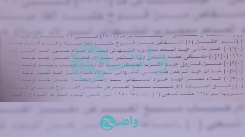ووفق الوثيقة الرسمية، فقد شملت الاعتقالات خمسة أفراد من فوج حشد الطارمية، وهم: