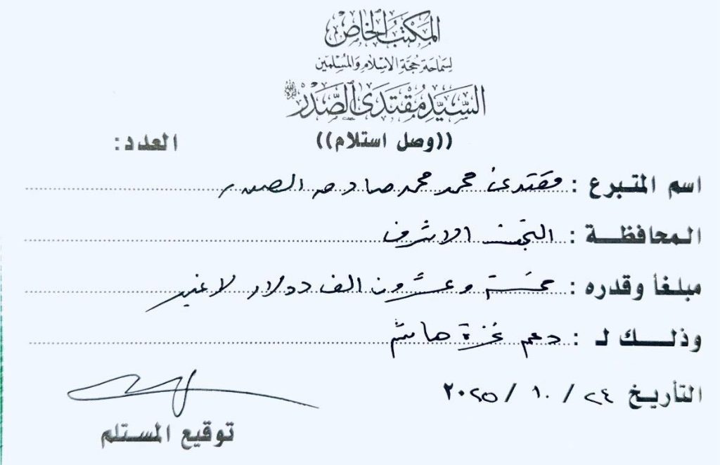 وانطلقت الحملة التي دعا إليها السيد الصدر اليوم الجمعة لجمع التبرعات النقدية “حصرا” في بغداد وجميع المحافظات.