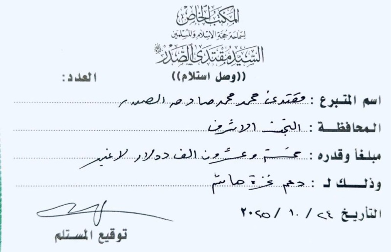 تبرع زعيم التيار الوطني الشيعي السيد مقتدى الصدر، اليوم الجمعة، بمبلغ 25 ألف دولار ضمن الحملة التي أطلقها للتبرعات النقدية لدعم قطاع غزة.