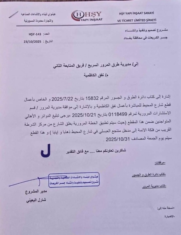 أعلنت مديرية الطرق والجسور، اليوم السبت، قطع الطريق الرابط في شارع المحيط ضمن منطقة الكاظمية في العاصمة بغداد، ابتداءً من يوم الجمعة المقبل، لغرض المباشرة بإنشاء نفق الكاظمية.