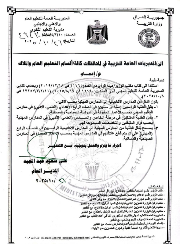 أعلنت وزارة التربية/ المديرية العامة للتعليم العام والاهلي والاجنبي، اليوم الاحد، ضوابط النقل من المدارس الأكاديمية الى المدارس المهنية وبالعكس للعام الدراسي ٢٠٢٥- ٢٠٢6.
